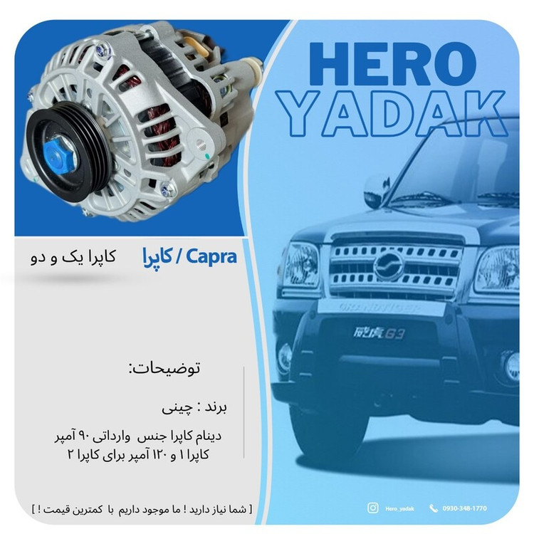 موجود در 2 مدل قیمت دینام کاپرا یک 4200 قیمت دینام کاپرا دو 4800 برند چینی هستش دینام کاپرا جنس وارداتی 90 آمپرکاپرا 1 و کاپرا دو120 آمپر